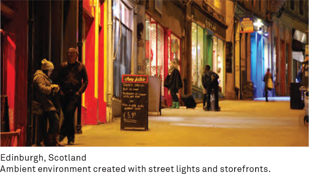 A consistent approach to color temperature should be applied throughout the lighting plan, although different color temperatures can be used to signify different users or types of travel. 3000 Kelvin (K) is often used for pedestrian paths and 5000K for vehicular paths.